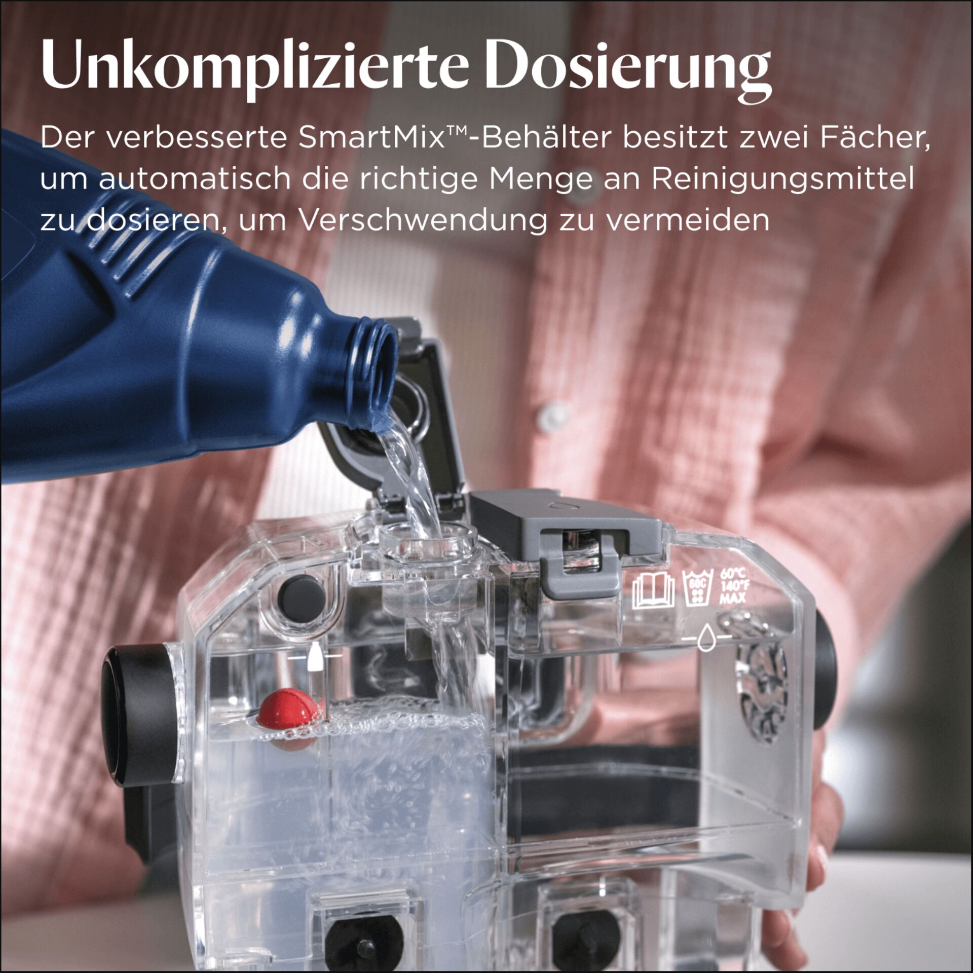 Ausgestattet mit einem SmartMixTM-Tank für eine mühelose Dosierung sorgt er jedes Mal für die perfekte Menge an Reinigungslösung. Wählen Sie zwischen dem Clean-Modus für alltägliche Verschmutzungen und dem Max Clean-Modus für hartnäckige Flecken.