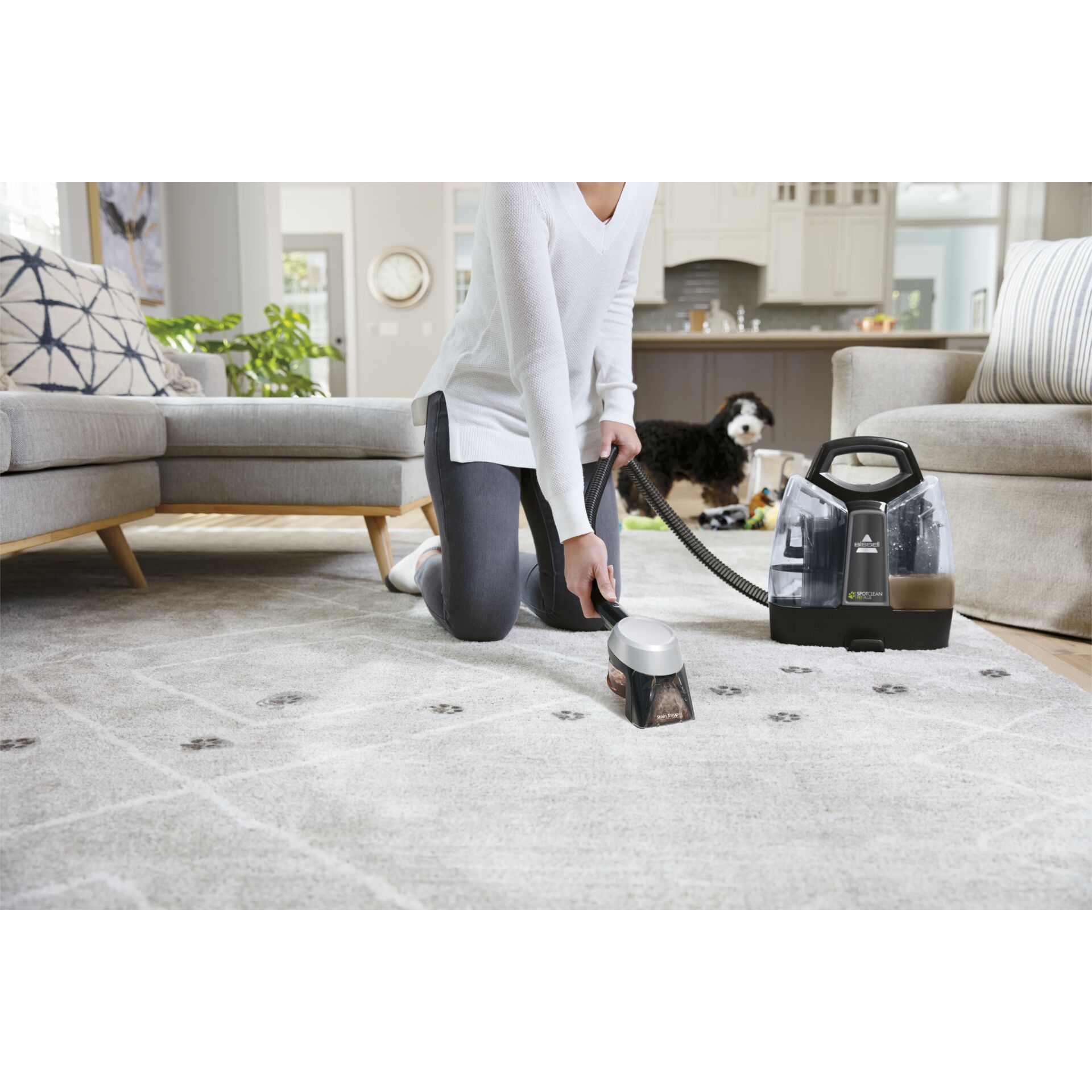 - Beseitigen Sie die hartnäckigsten Flecken und Gerüche von Haustieren mit dem Stain Trapper Tool, der die Verschmutzungen außerhalb des Geräts behält.