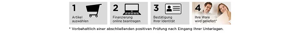 Hinweise: Unser Finanzierungsangebot gilt nur für Antragsteller mit Wohnsitz in Deutschland. Blitzversand ist in Verbindung mit einer Finanzierung nicht möglich.